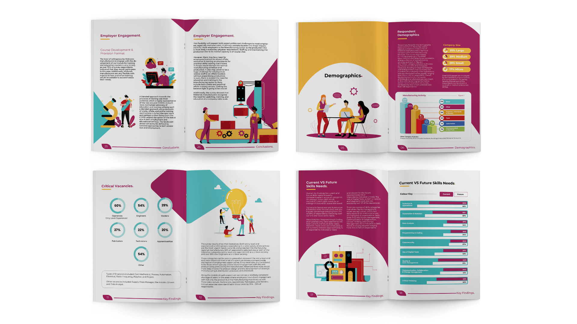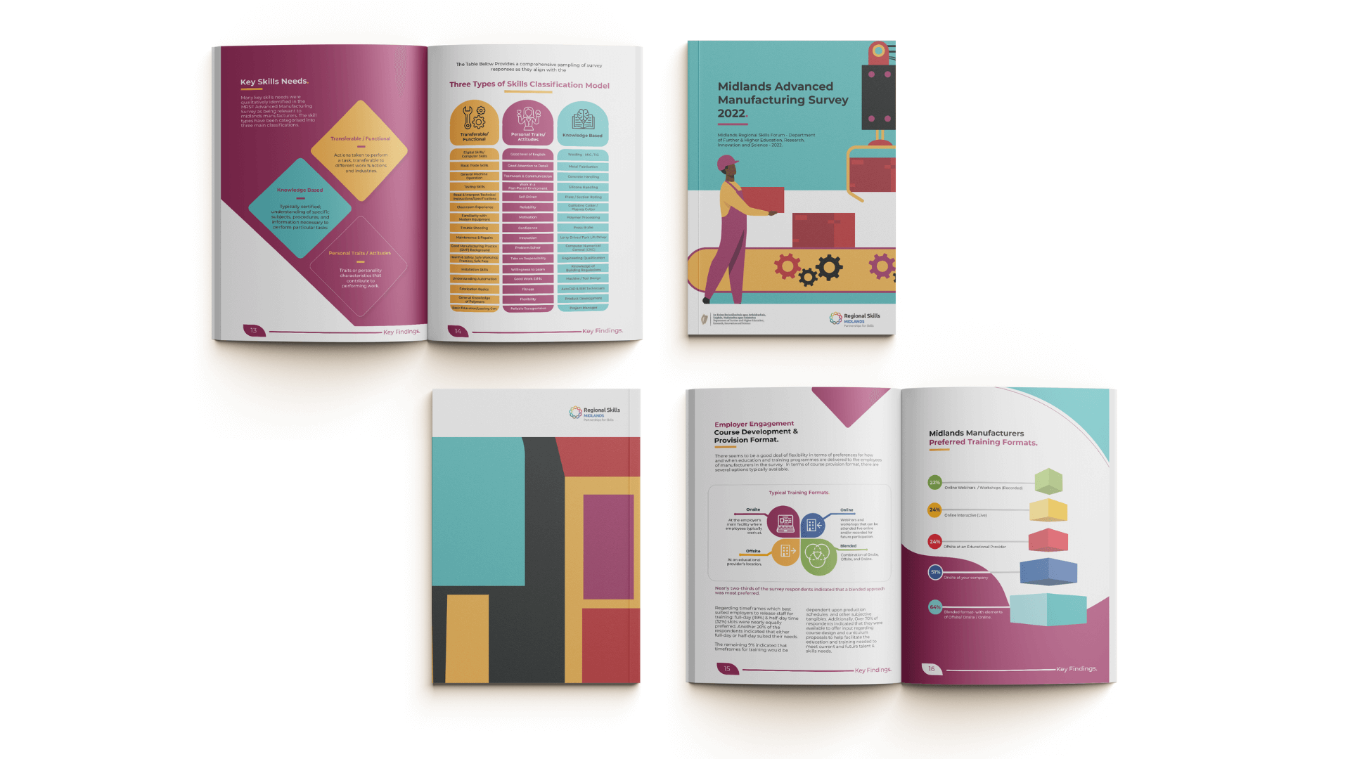 Midland Regional Skills carried out an insightful survey on the manufacturing industry in Ireland's Midlands. This report visually narrates the findings and outcomes from this survey in an easy-read format. This project was the first time Regional Skills used a brand colour palette, type face and illustrations that were designed specifically for them. Months later, the company now embodies a clear and impactful visual presence on all printed material.